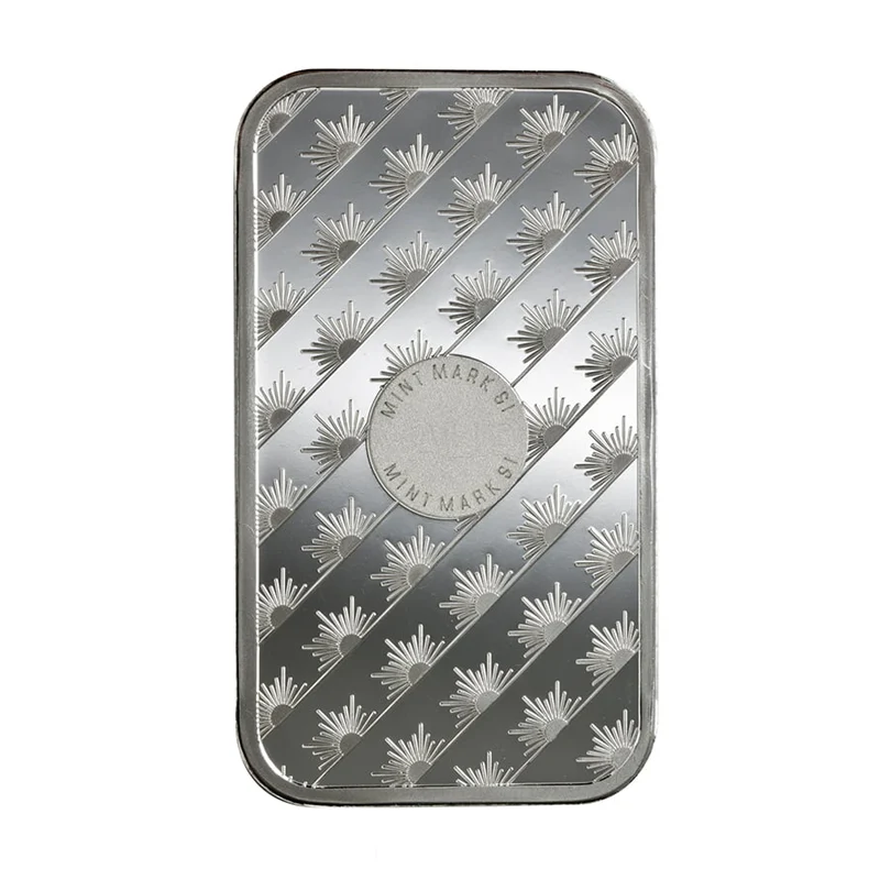 Since 1979 The Sunshine Mint respected for its expertise in design and artisanship. The obverse of the bar has a beautiful eagle with the rays of the sun behind him, surrounded by SUNSHINE MINTING. The bar has the fineness of .999 Silver and the weight struck into the bar. The reverse of the bar displays a repetitive diagonal sunrise pattern with Sunshine Minting security feature in the center. Sunshine Mint protects its silver bars with anti-counterfeiting features. The SI mintmark uses state-of-the-art micro-engraving technology that is only visible with a specially designed security lens. Sunshine Silver Bars are IRA-eligible.